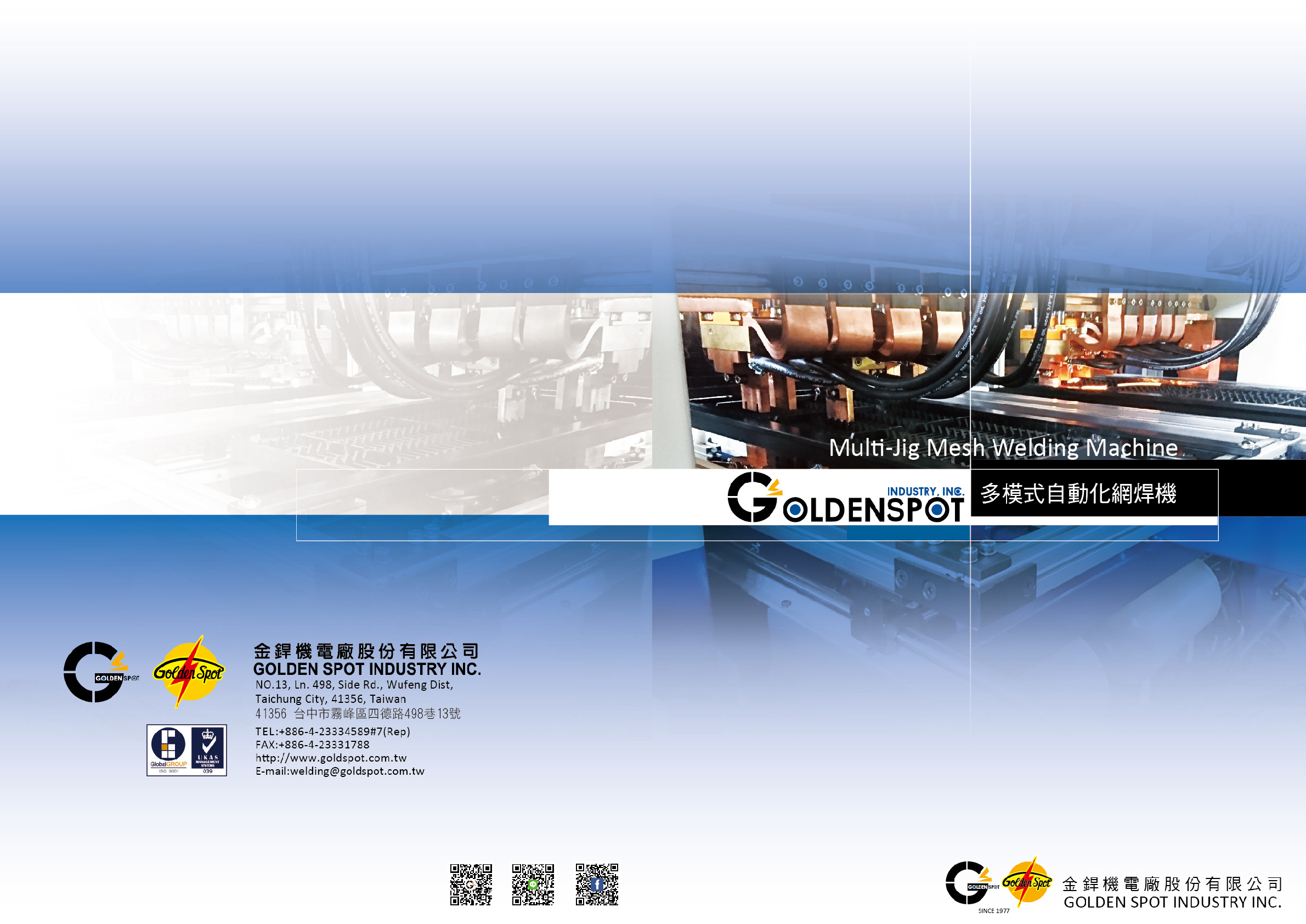 Since 1979, Golden Spot Industry is now a leading brand of spot welding machines in Asia Pacific. Through our strict quality control in each stage of the production process from design to finalize machine lines are accomplished under one roof. Our excellent R&D team with near 40 patents made our superior technology basis. With CE and ISO-9001 (R&D) certifications, we provide global standard professional services and machines.