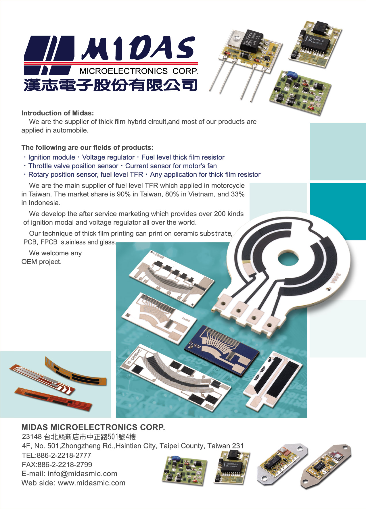 Midas provides full range thick film product design solutions and manufactures thick film hybrid circuit, thick film resistor, thick film resistor network, ceramic PCB, Thick film heating element(including steal, aluminum, ceramic and flexible PCB substrate)。