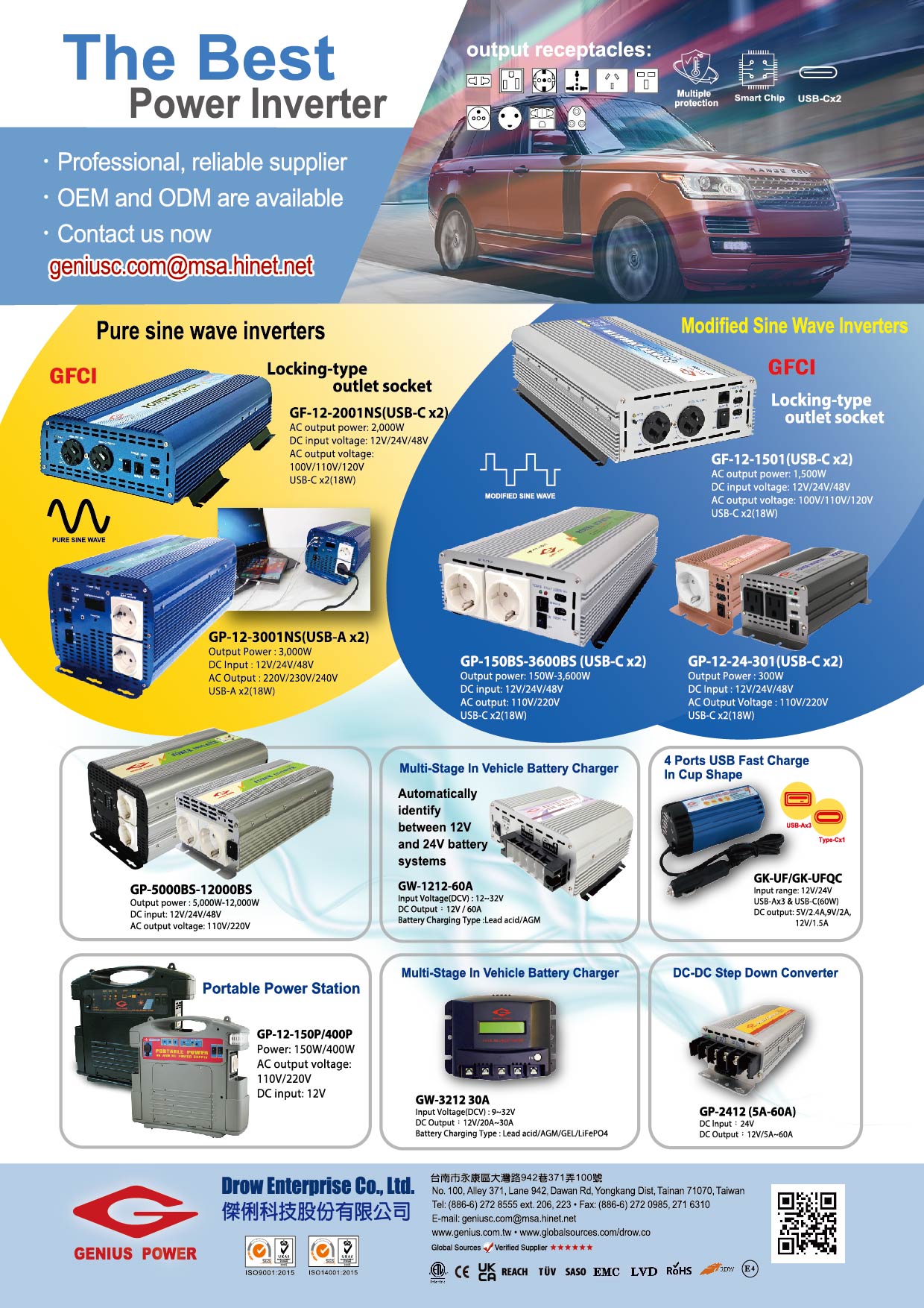 DROW was established since 1984. We specialize in manufacturing sine wave and modified sine wave DC to AC power inverters. Our "GENIUS" Brand is now successfully regarded as a major supplier in the field of solar inverters and UPS. Based on outstanding experience, we manufactured preferable solar related power products in order to make great effort for the environment protection. With the best quality, reliable price and innovate technology, our customers are assured to receive excellent services at all times! Our goal is to do our best to maximize the world energy effect d and will benefit our society and earth to provide perfect living environment and quality.