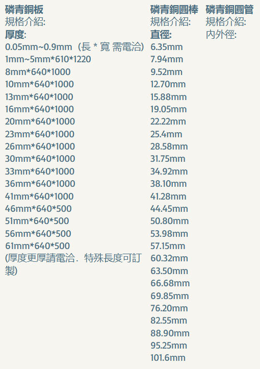 Phosphor bronze: C5191: plates, CAC502C: plates, round bars, round tubes