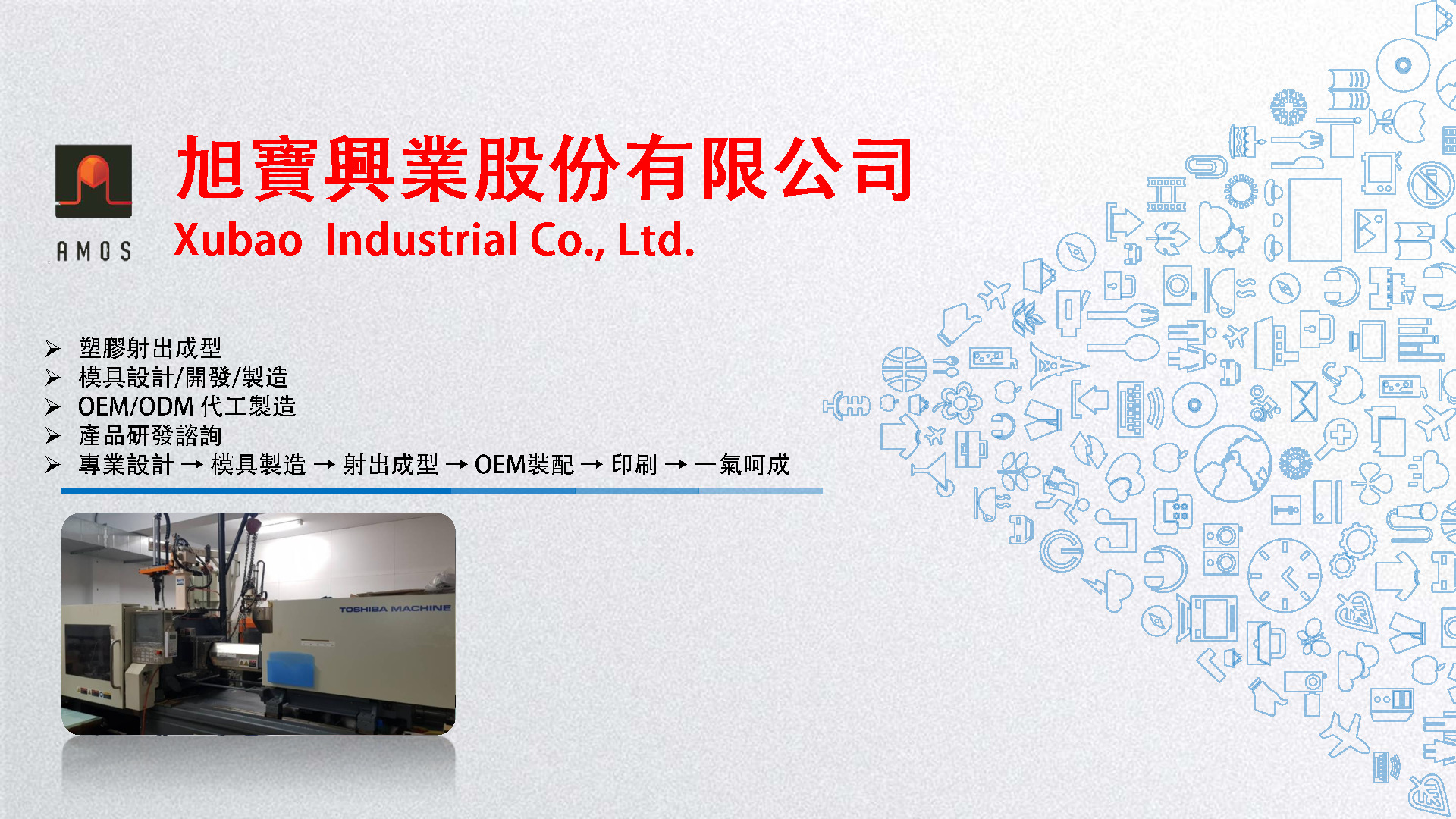 塑膠射出代工、模具開發:旭寶塑膠射出廠位於台北汐止,專營塑膠射出、模具開發相關業務。旭寶創立於1988年,在射出代工領域上有25年以上的經驗,擅長分析射出問題及解決成形困難,持續服務客戶各類塑膠品開發。除了射出代工外,我們也致力於模具開發及成品研發,善用射出成型的專業知識,開發出最適合塑膠件的模具結構,並藉由我們在射出加工時對各類型產品的多方了解,給予不同面向的建議,與您一同研發新產品。