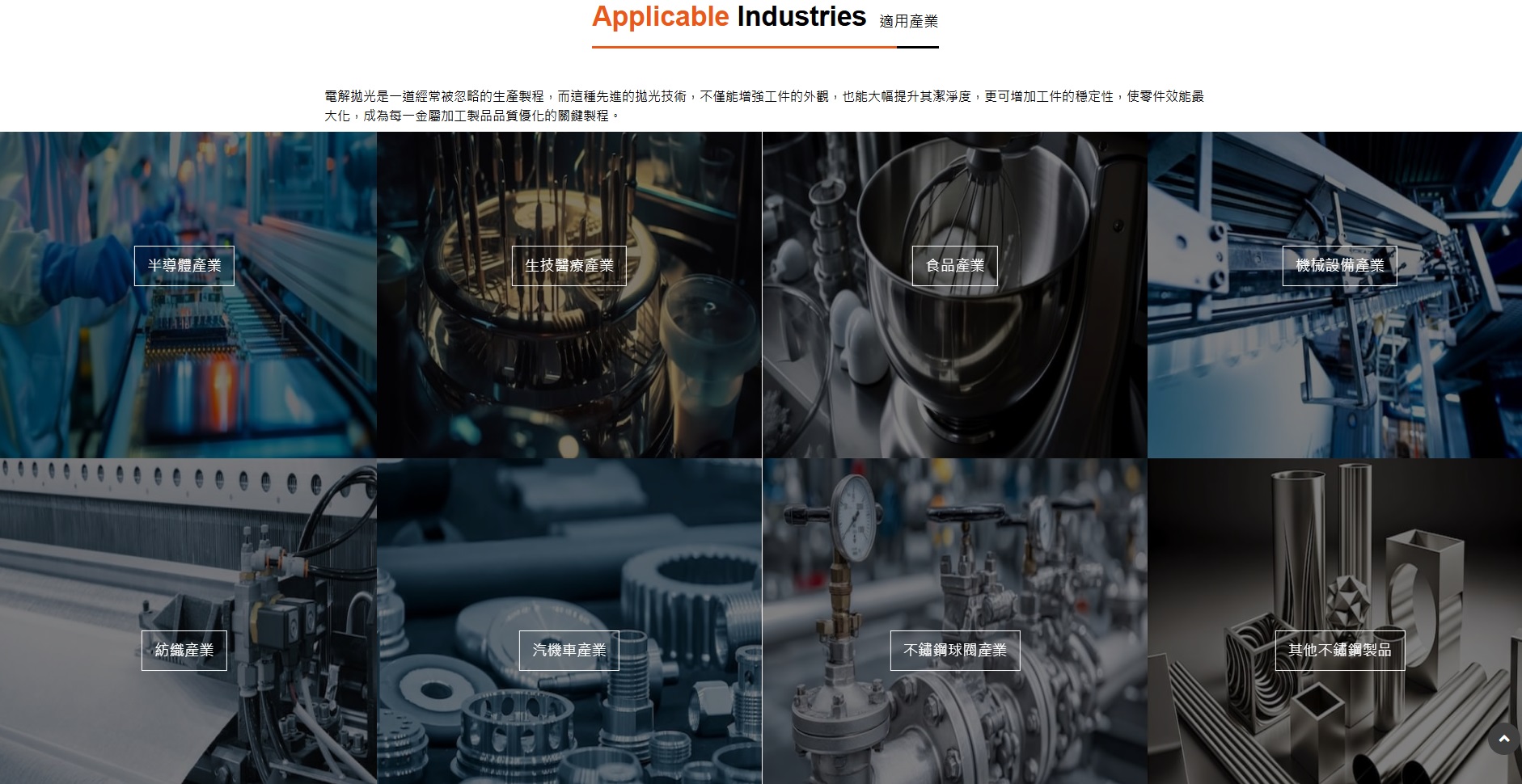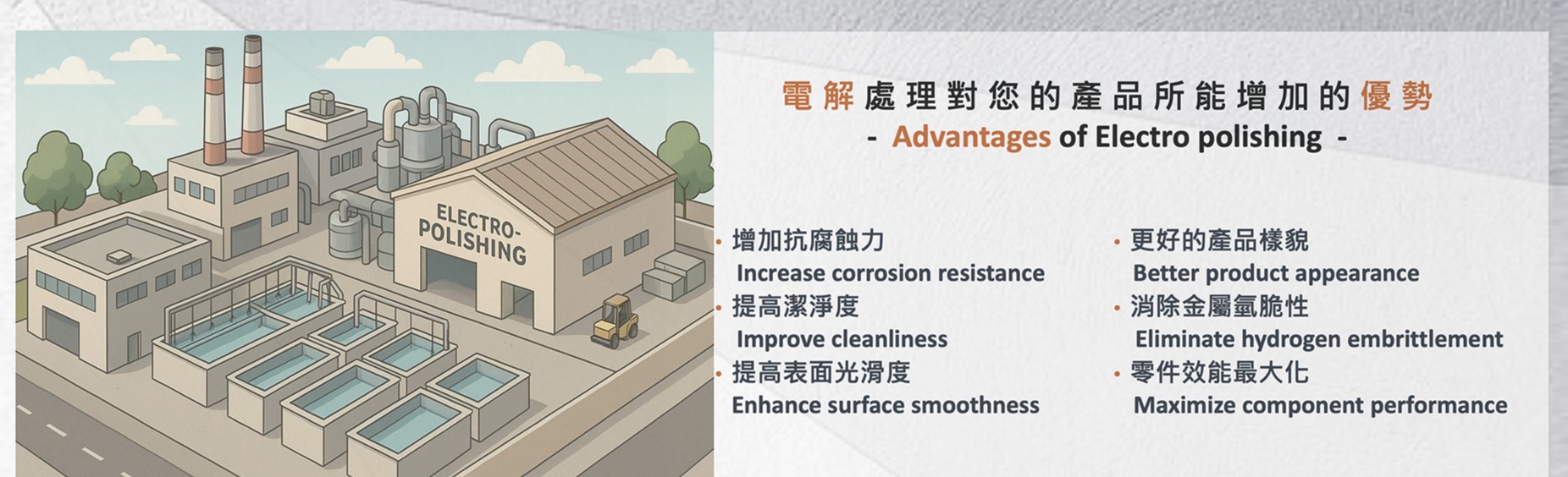 AUXLONG SPRING TRADING CO., LTD. originated in the production and sales of chemical raw materials. We offer our proprietary formulations, including electrolytes, pH adjusters, and stabilizers, alongside comprehensive metal processing services. Our core expertise lies in providing high-quality Stainless Steel Electropolishing (EP) and Passivation Treatment services.We specialize in customized production and processing for a wide range of industries, including:
